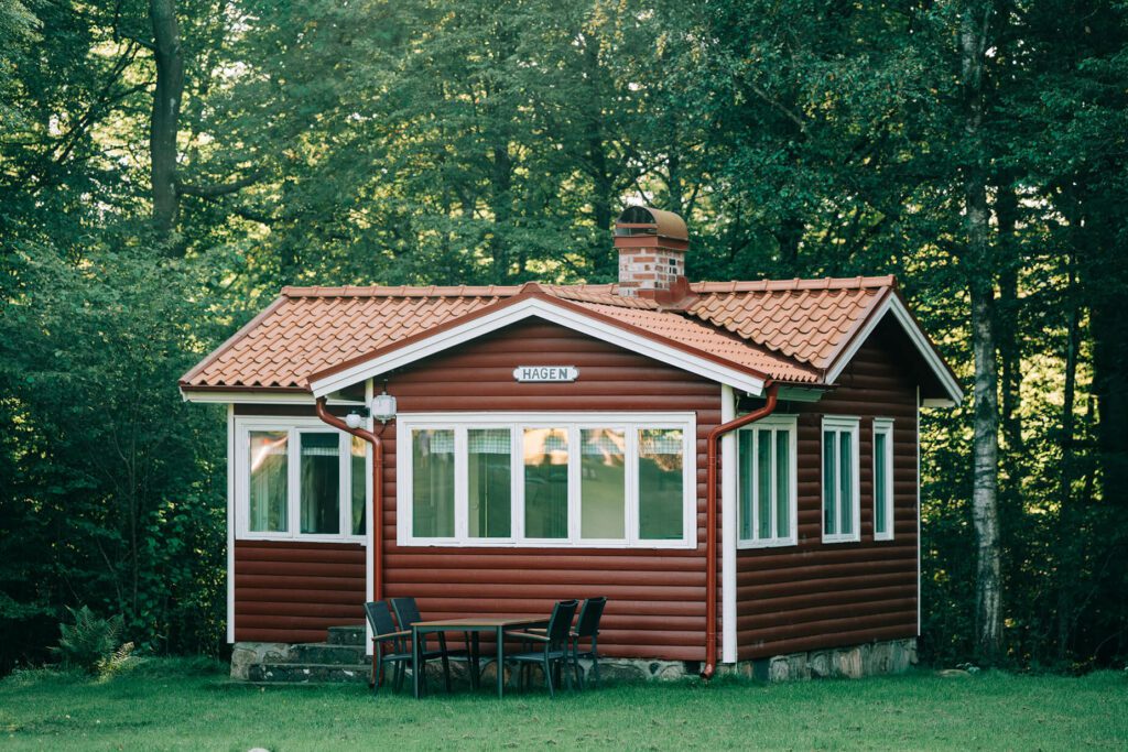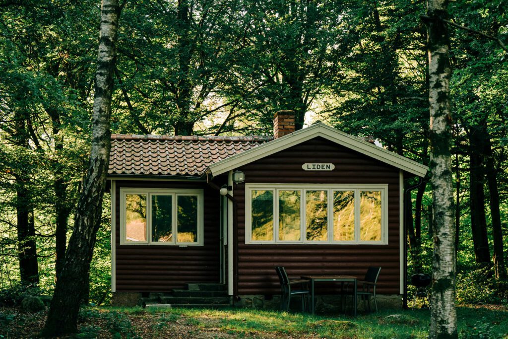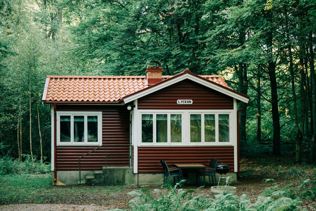 Stugorna ligger vackert på höjden med utsikt över sjön, mitt i det skånska landskapet.